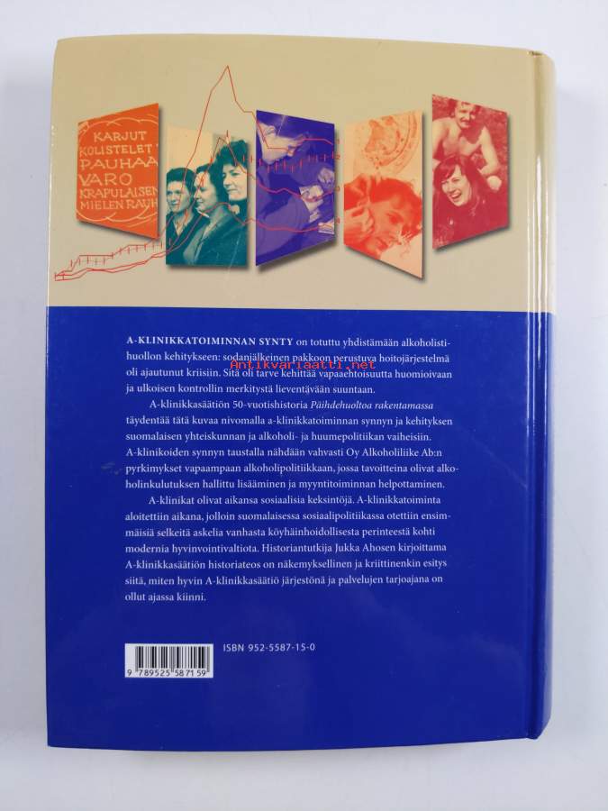 Sarja: A-klinikkasäätiön raporttisarja nro 51Asiasanat: historiikit, alkoholipolitiikka, sosiaalihistoria, palvelut, lainsäädäntö, riippuvuus, säätiöt, hoito, alkoholismi, sosiaalityö, alkoholinkäyttö, huumeet, rahoitus, sosiaalihuolto, päihdehuolto, alkoholiongelmat, tutkimustoiminta, toimintamuodot, päihdepolitiikka, huumeriippuvuus, päihdetyö, huumeiden käyttö, socialhistoria, forskningsverksamhet, alkoholism, narkotika, A-klinikat, vård, missbrukarvård, alkoholproblem, lagstiftning, finansiering, stiftelser, alkoholanvändning, historiker (verk), rusmedelsarbete, beroende, socialvård, drogberoende, tjänster (service), socialt arbete, verksamhetsformer, alkoholpolitik, droganvändning, rusmedelspolitik, A-kliniker