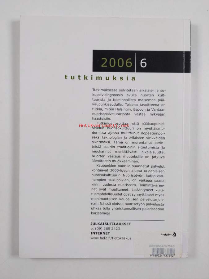 Muu(t) tekijä(t): Magnus Gräsbeck, Marika GallarSarja: Tutkimuksia / Helsingin kaupungin tietokeskus 2006/6Asiasanat: elämäntapa, palvelut, nuoret, identiteetti, kaupunkitutkimus, osakulttuurit, nuorisotyö, sosiaalipolitiikka, nuorisokulttuuri, sosiaalinen rakenne, sosiologia, nuorisotoimi, nuorisotutkimus, culture, Adolescent, pääkaupunkiseutu (Suomi), Subculture