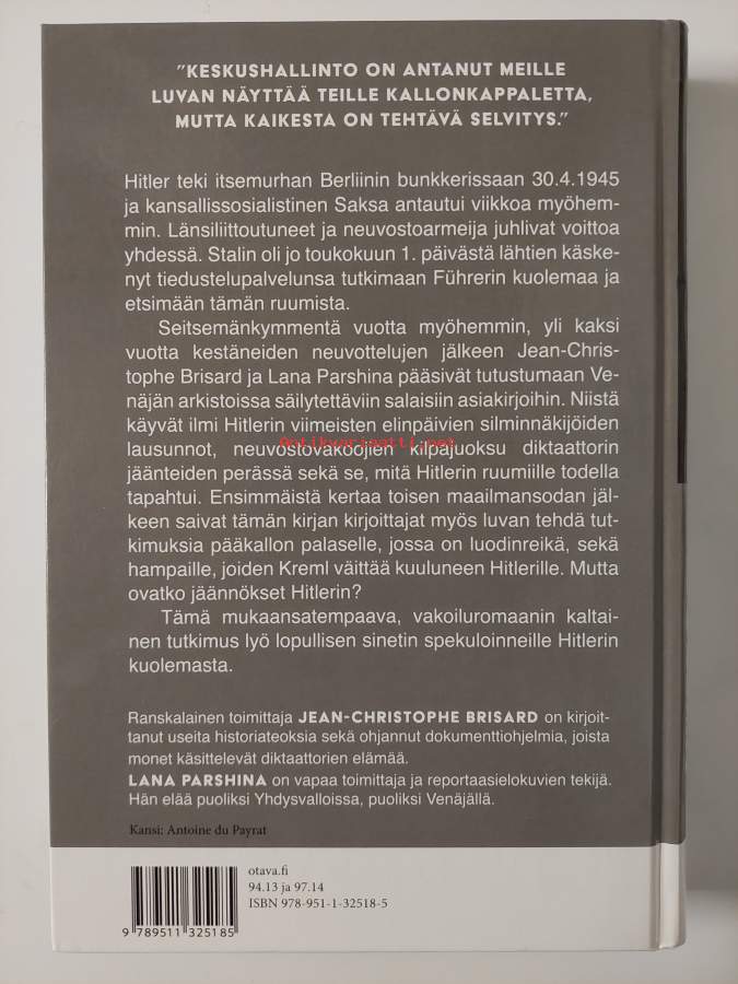 Muu(t) tekijä(t): Ville Keynäs, Lana ParshinaAlkuteos: La mort d'HitlerAsiasanat: sotahistoria, toinen maailmansota, poliittiset johtajat, kuolema, valtionpäämiehet, kansallissosialismi, turvallisuuspalvelut, asiakirjat, natsit, kolmas valtakunta, ruumis, hävittäminen, salaus, nazism, andra världskriget, politiska ledare, döden, handlingar, krigshistoria, statsöverhuvud, hemligheter, Tredje riket, nazister, säkerhetstjänster