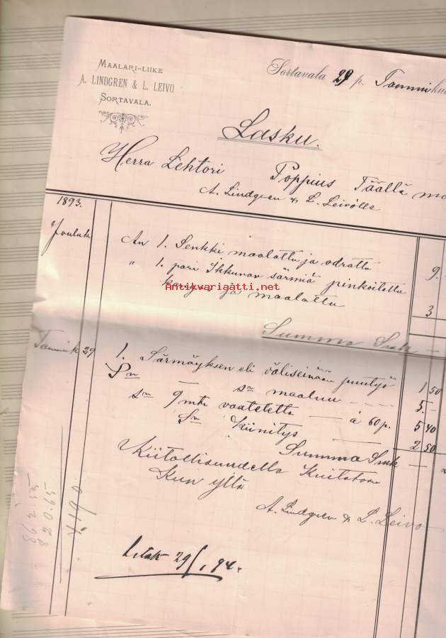 Lasku: Maalarinliike A. Lindgren & Leivo, Sortavala (1894)