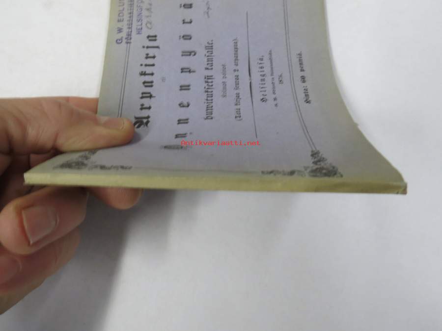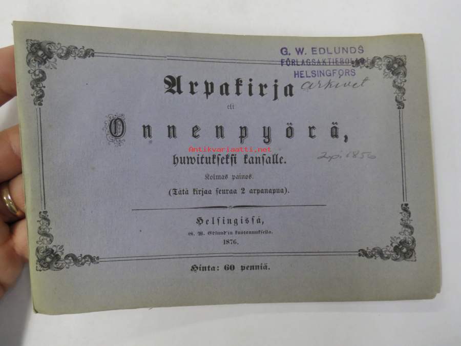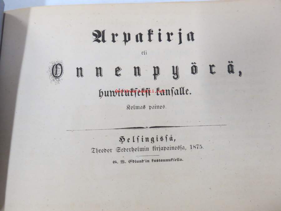 Arpakirja eli Onnenpyörä, huvitukseksi kansalle. Kolmas painos. 1876, erittäin harvinainen, tämä kappale kuulunut kustantajan G.W. Edlundin arkistoon