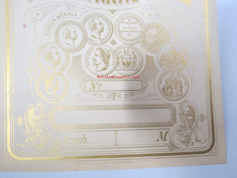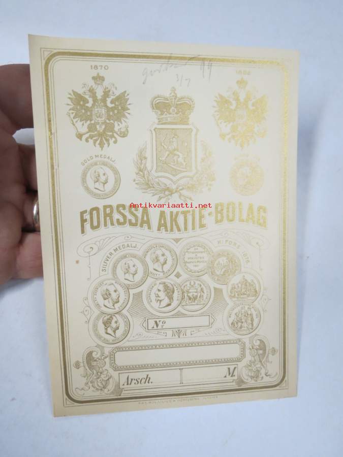 Forssa Aktie-Bolag - För 1870 års Exposition - Silvermedalj Helsingfors 1876 - 1882 -kangaspakan etiketti