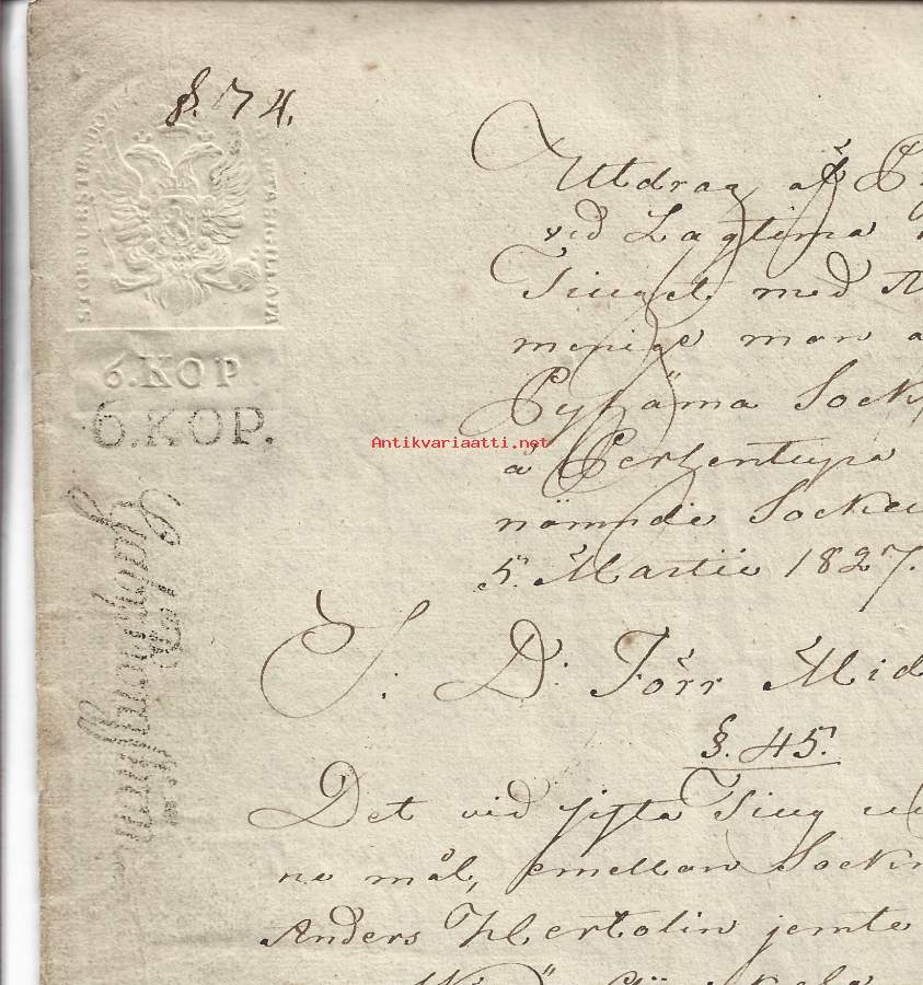Veroleimapaperi 6 kop kohopainoleima Kamreeri Gabr Borgström Vesileimapaperi 1827