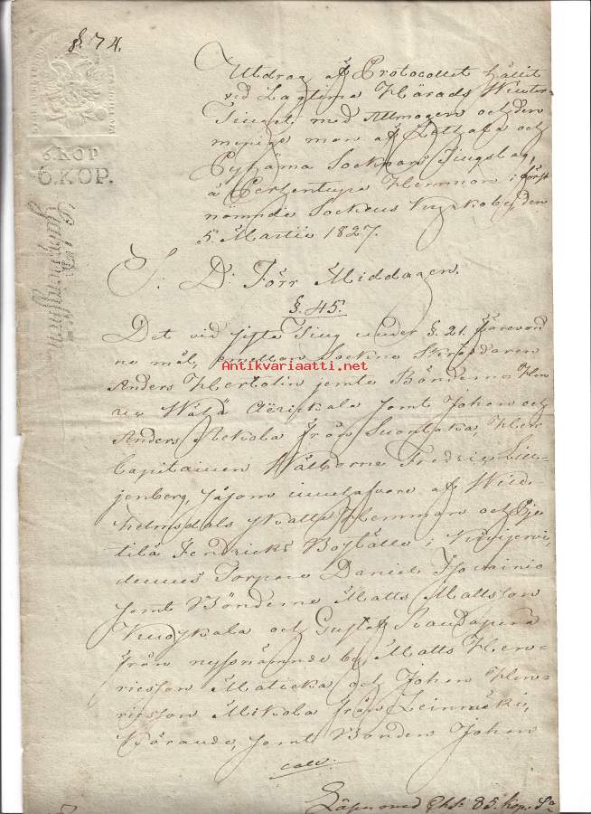 Veroleimapaperi 50 kop kohopainoleima Kamreeri Carl Johan Lannér, kontrollileima m 1845 punainen Vesileimapaperi JU (Juvankoski ) Åbo 1851 asiakirja