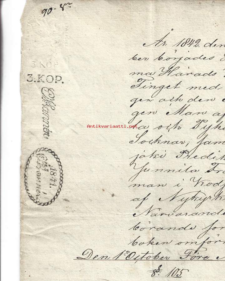 Veroleimapaperi 50 kop kohopainoleima Kamreeri Carl Johan Lannér, kontrollileima m 1845 punainen Vesileimapaperi JU (Juvankoski ) Åbo 1851 asiakirja