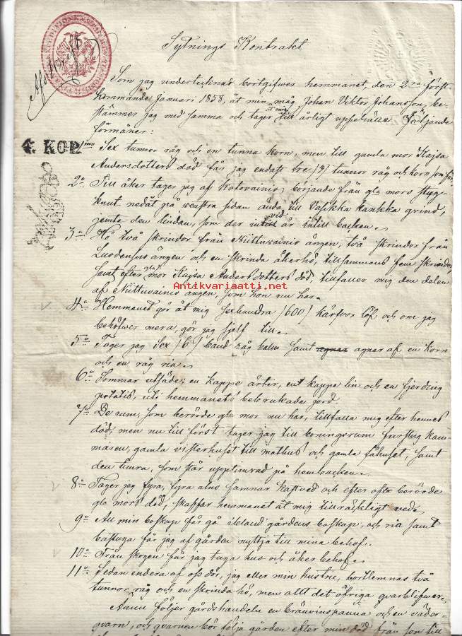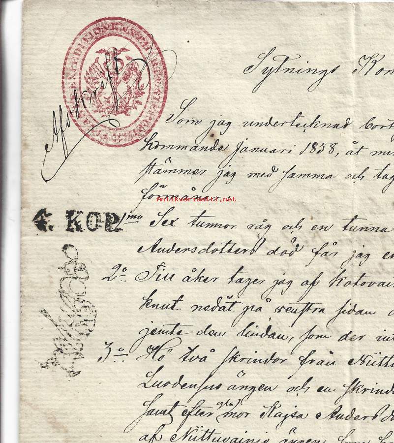 Veroleimapaperi 50 kop kohopainoleima Kamreeri Carl Johan Lannér, kontrollileima m 1845 punainen Vesileimapaperi JU (Juvankoski ) Åbo 1851 asiakirja