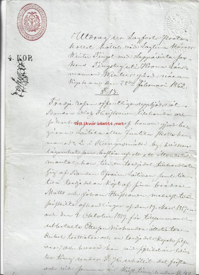 Veroleimapaperi 4 kop kohopainoleima Kamreeri L O PrytzVesileimapaperi 1862