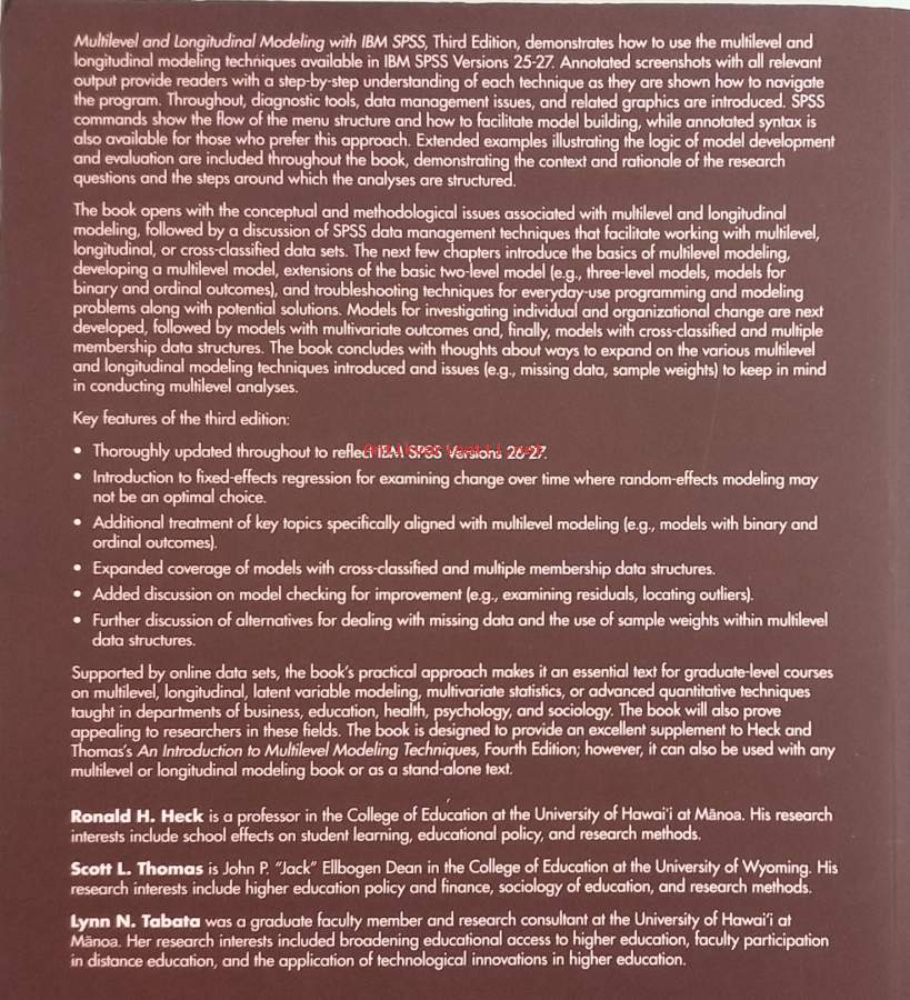 Opastaa käyttämään IBM SPSS:n versioiden 25–27 monitaso- ja pitkittäismallinnustyökaluja. Näyttää, miten SPSS:n valikkorakenne ja komennot tukevat mallinnusta jne. Kirja siis käsittelee tilastollisia menetelmiä, joilla tutkitaan dataa, jossa on monta tasoa tai jossa samoja ihmisiä/ilmiöitä seurataan pitkän ajan yli. Dimensiot 28 ¤ 21 cm.