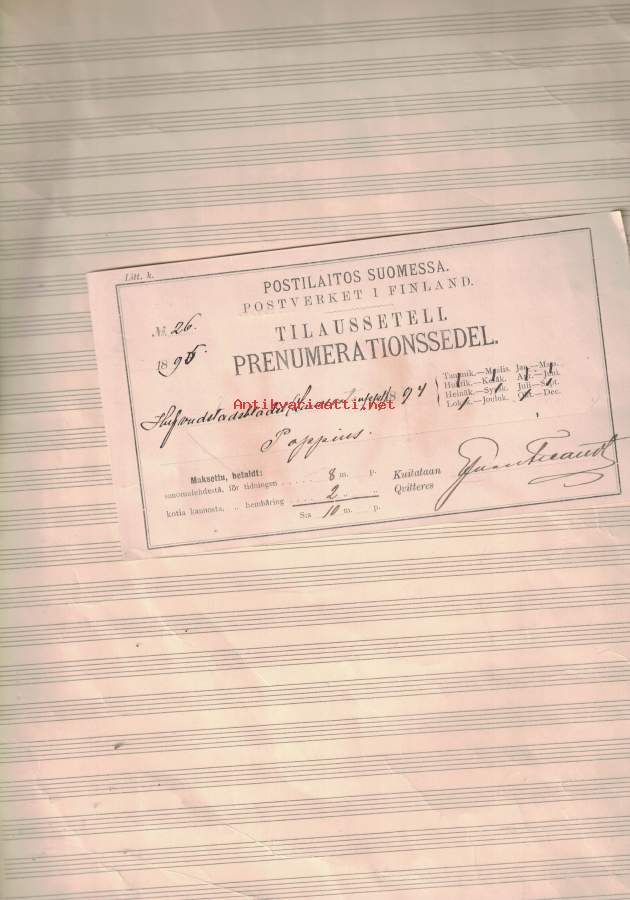 Postilaitos Suomessa: Tilausseteli - Prenumerationssedel 1894