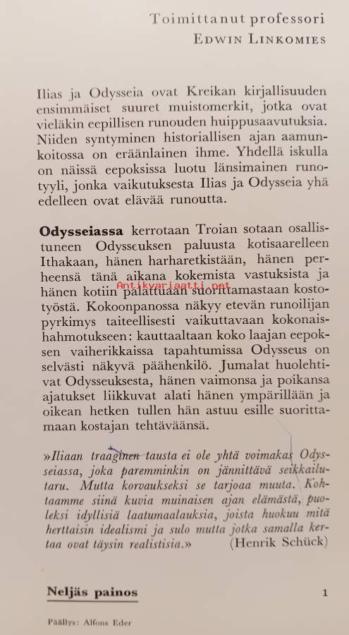 Odysseia (+näköispainos Homeroon Odysseian kuudes runoelma)