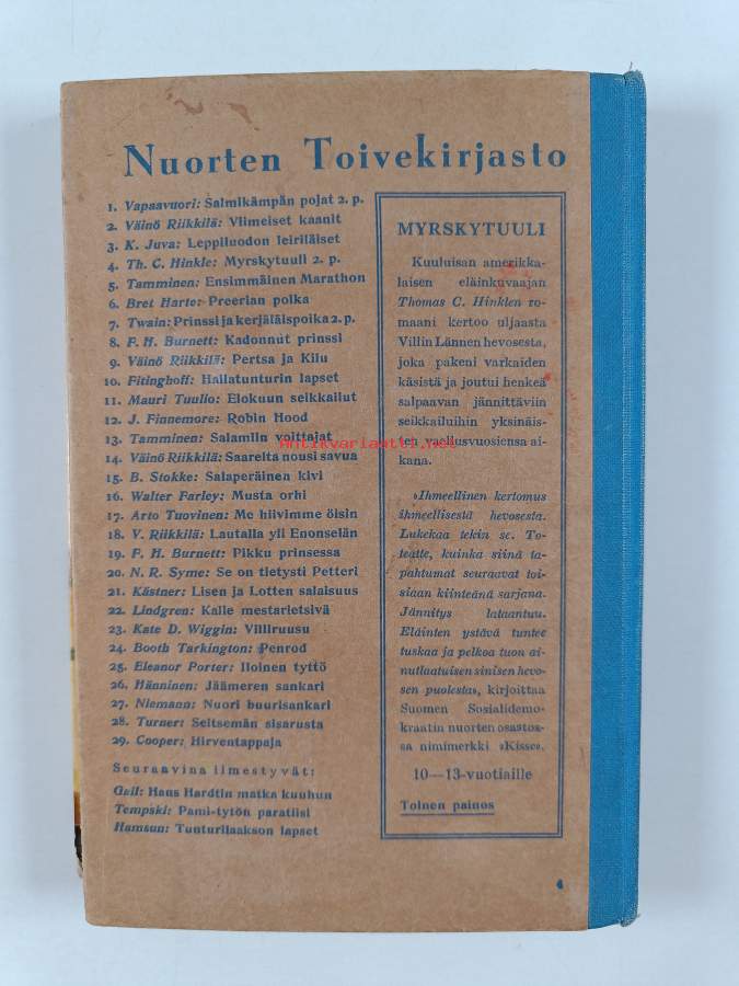 Tyydyttävä. Tarkempi kuntoluokka: K2+ ; Hieman kolhua kulmissa, hieman kulumaa, selkämyksessä hieman vinoutta, sidos hieman näkyvissä parilla aukeamalla