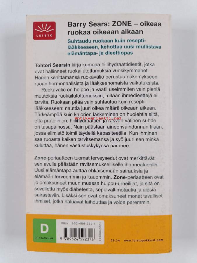 Muu(t) tekijä(t): Else-Maj TaskinenAlkuteos: The Zone : a dietary road mapAsiasanat: terveysvaikutukset, ruokavaliot, ravinto, Zone-dieetti