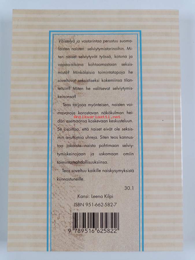 Muu(t) tekijä(t): Ilka KangasMerkinnät: omistajamerkintä leikattu pois etulehden ylälaidastaAsiasanat: naiset, naisen asema, työelämä, naistutkimus, sukupuoliroolit, tasa-arvo, syrjintä, sukupuolisyrjintä, vastarinta, sukupuolinen häirintä, suoriutuminen