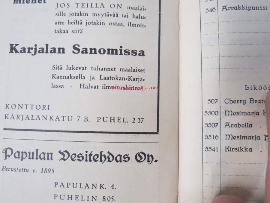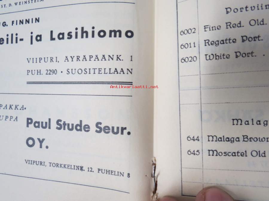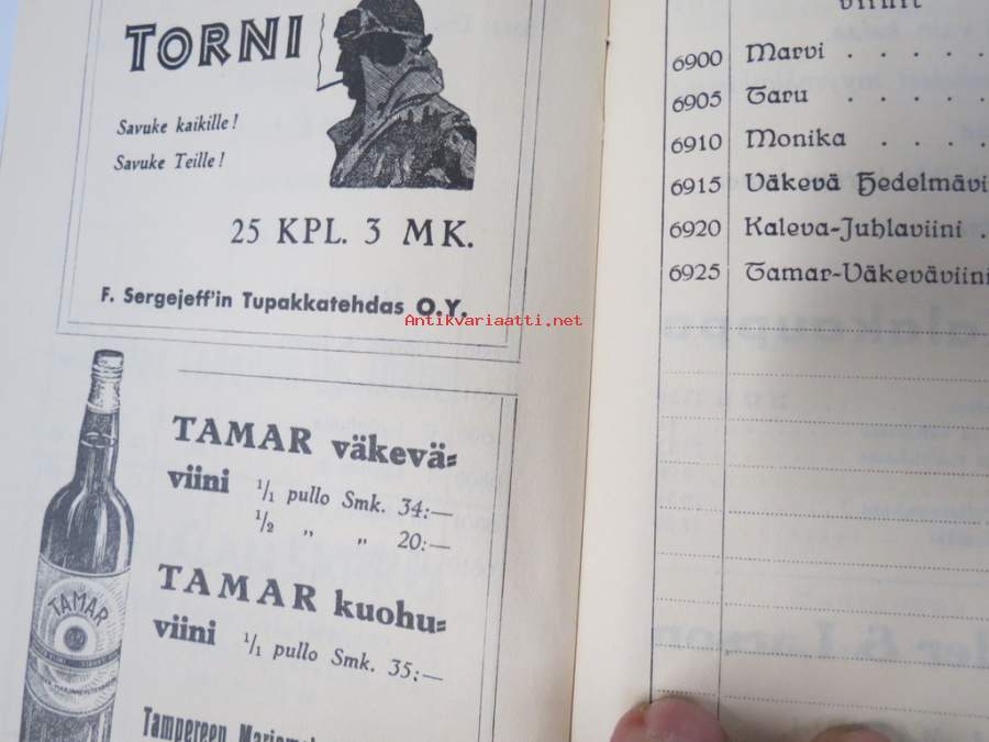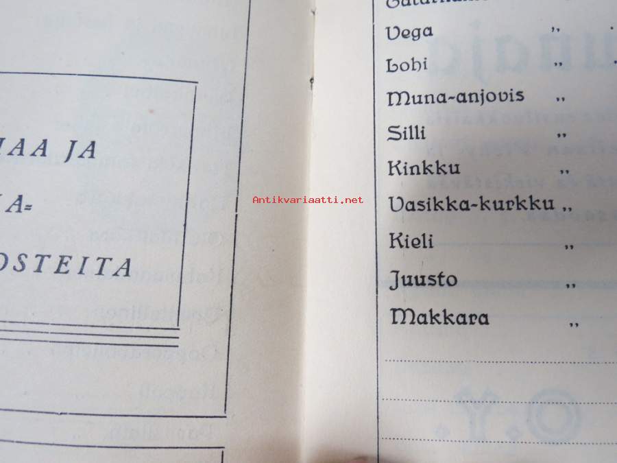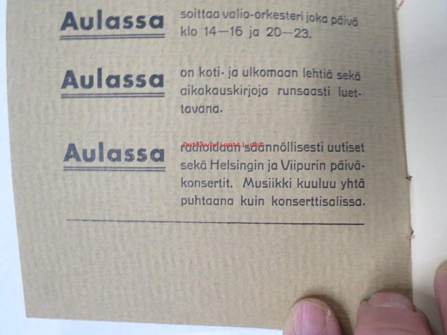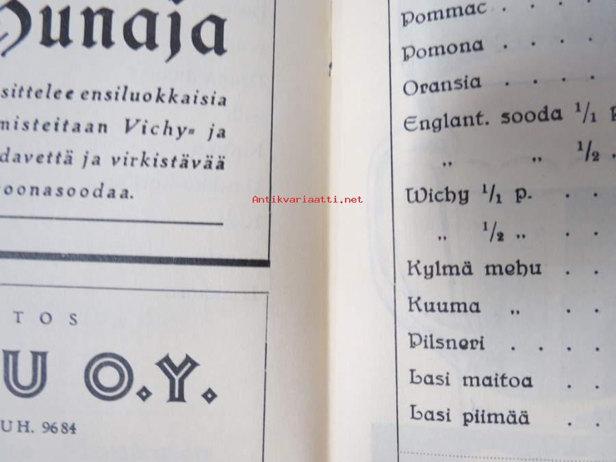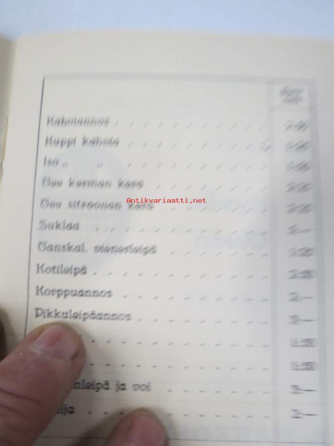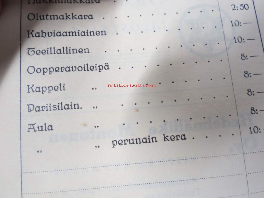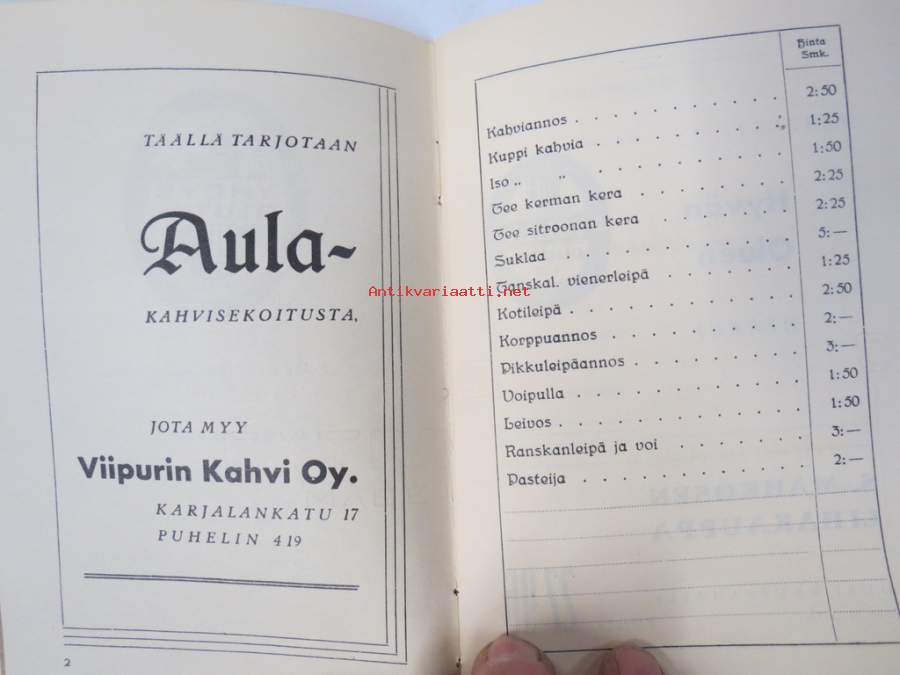Kahvila Aula, Viipuri - Hinnasto 1935