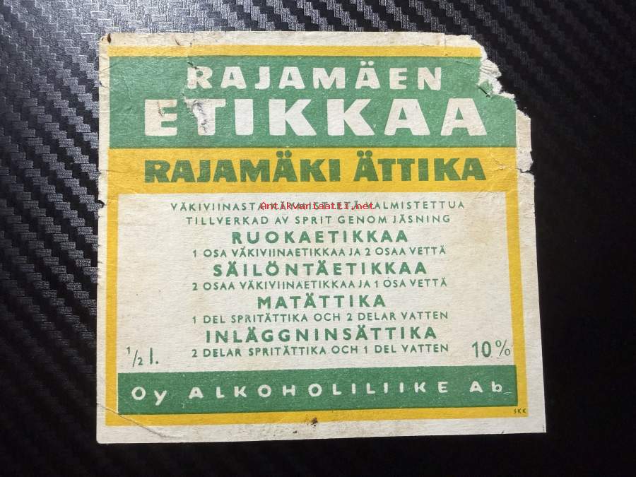 Karhulan tehtaan vanha pullo, etiketti Rajamäen tehtaiden väkiviina etikkaa