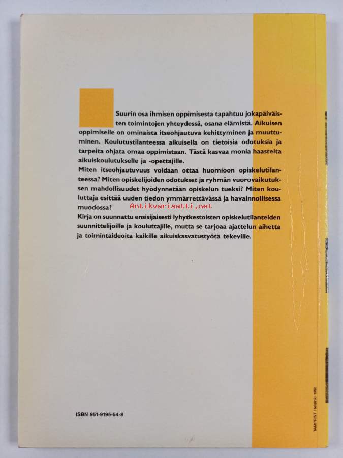 Muu(t) tekijä(t): Ahti Valke, Eija WilenMerkinnät: omistajamerkintäAsiasanat: oppiminen, aikuiset, aikuiskasvatus, aikuiskoulutus, inlärning, vuxenpedagogik, vuxenutbildning, vuxna