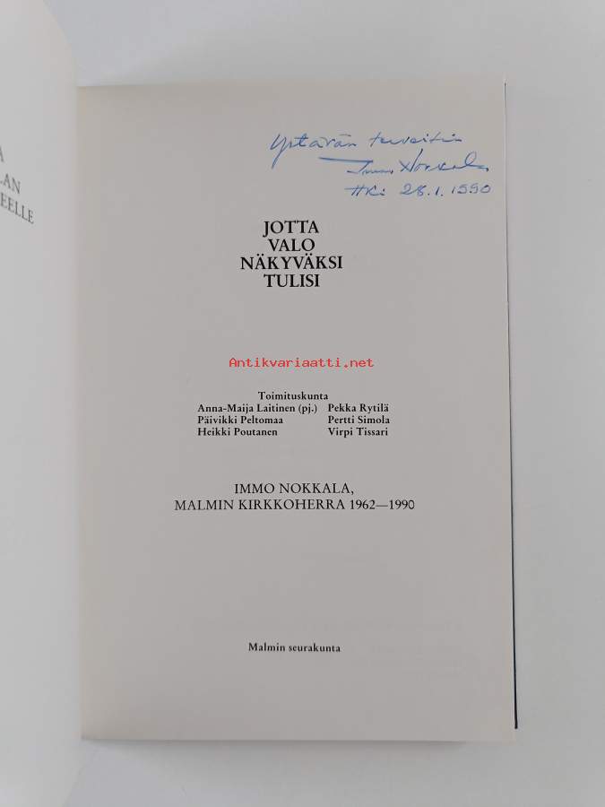 Jotta valo näkyväksi tulisi : Immo Nokkala, Malmin kirkkoherra 1962-1990 : juhlakirja Immo Nokkalan jäädessä eläkkeelle 31.1.1990 (signeerattu, tekijän omiste)