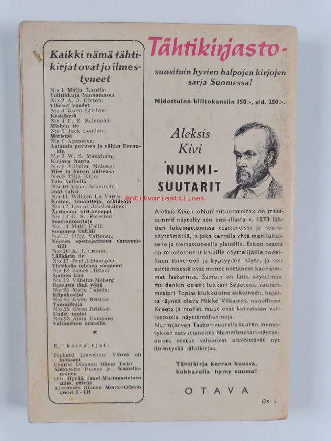 Hyvä. Tarkempi kuntoluokka: K3- ; Hieman taitejälkeä kansissa, hieman kulumaa, selkämyksessä hieman vinoutta, selkämyksessä lukutaittumaa