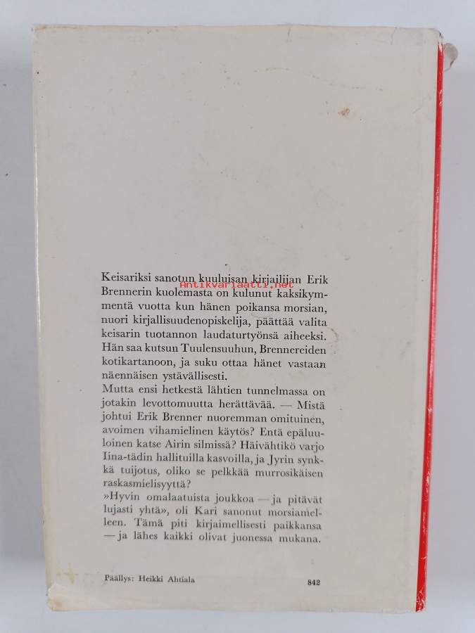 Hyvä. Pienoista kulumaa kansissa, selkämyksessä hieman vinoutta. Kansipaperin kunto: joitain repeämiä/kulumaa / sisäkannessa ja etulehdellä töherrystä