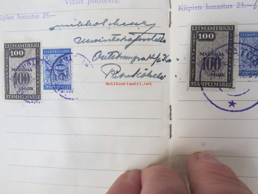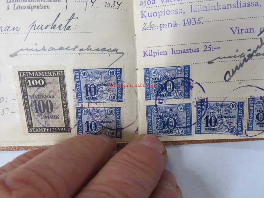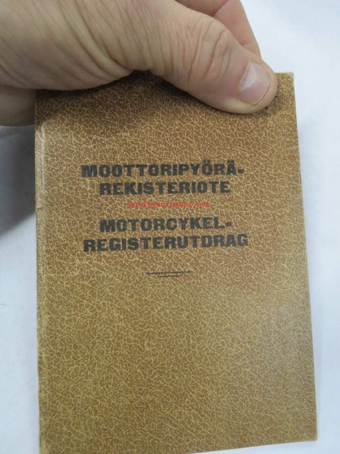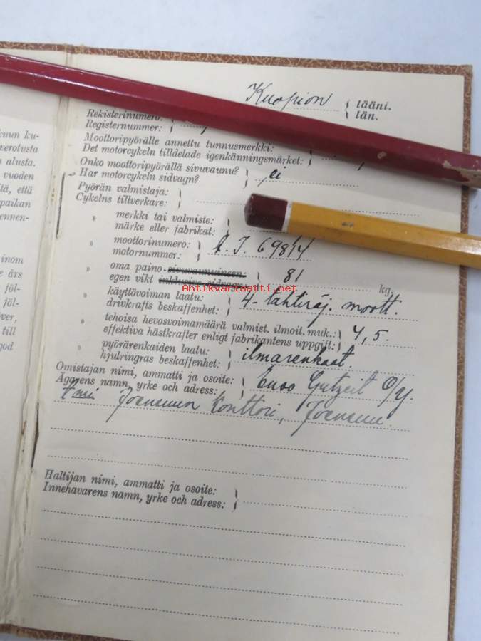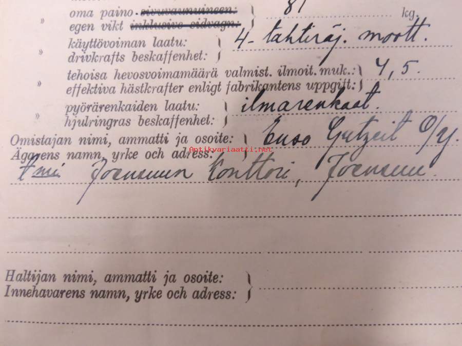Radco-Jap, nelitahtiräj. moottoripyörä, Kuopion lääni rek. nro K-... -rekisteriote vuodelta 1934, pyörä ollut Enso-Gutzeit Oy:n Joensuun konttorin käytössä