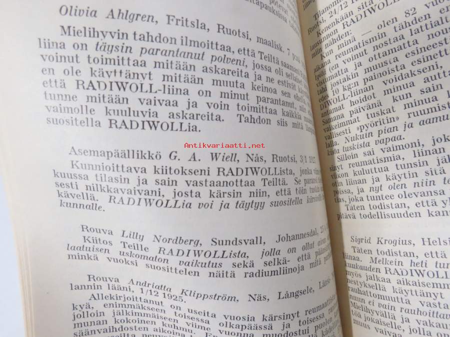 Radiwoll liinan tuotepakkaus ja käyttöohje ruotsiksi sekä suomenkielinen todistus radioaktiivisuudesta, itse liina puuttuu vuodelta 1927