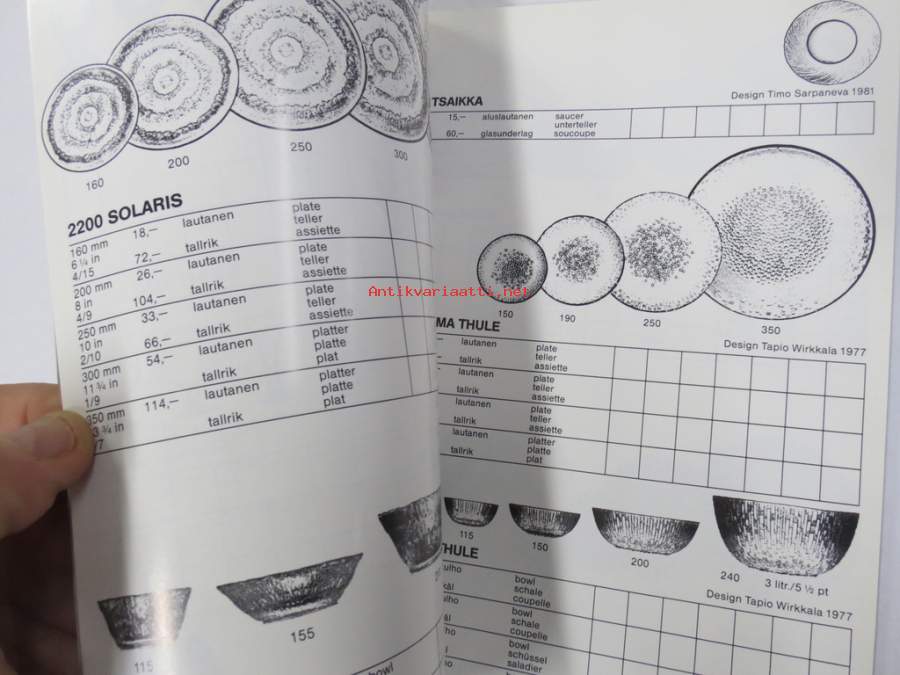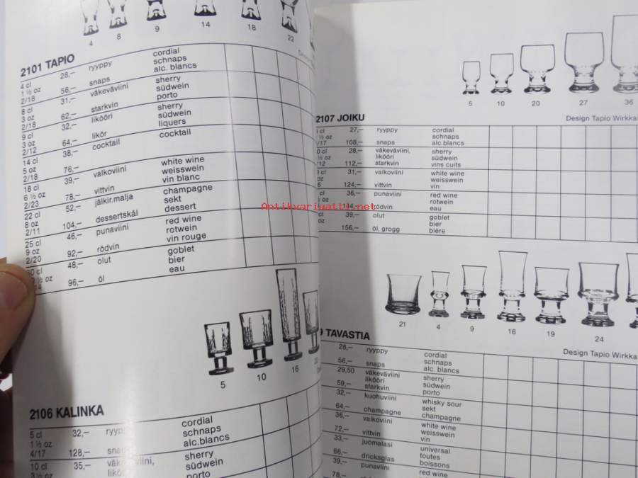 Ahlström Iittala -tuoteluettelo / myyntiesite; Tsaikka, Paula, Otso, Gaissa, Pisaranrengas, Aslak, Niva, Kalinka, Ultima Thule, Valssi, Marski, Tapio, Senaattori ym.
