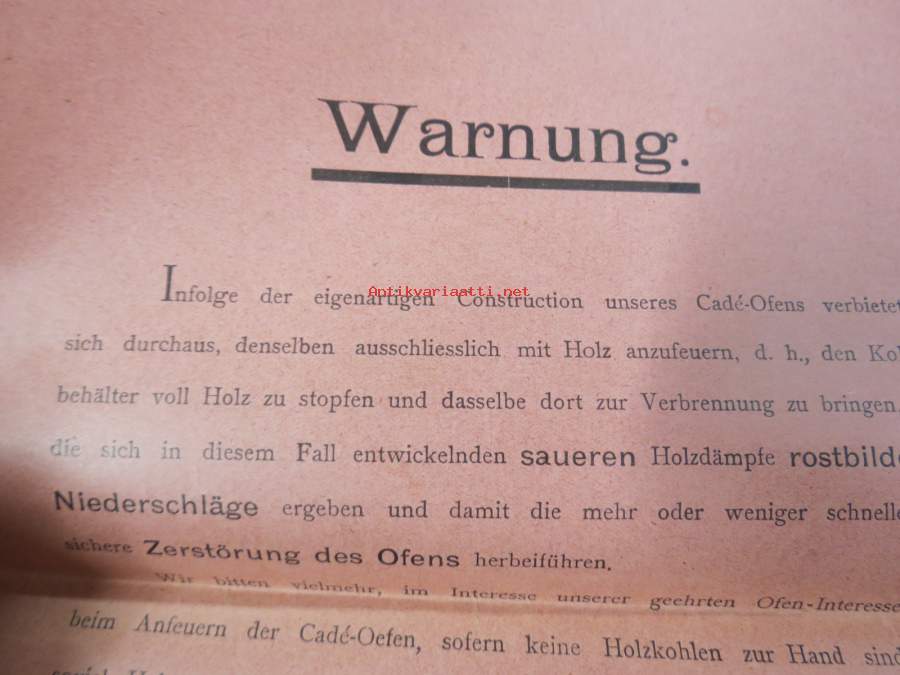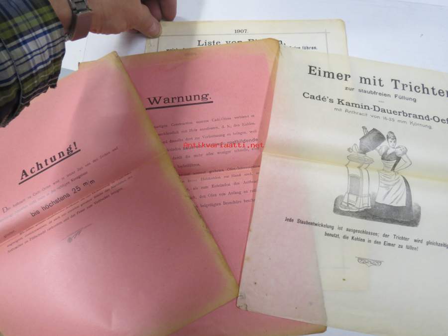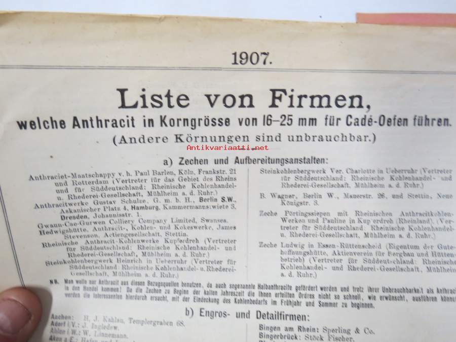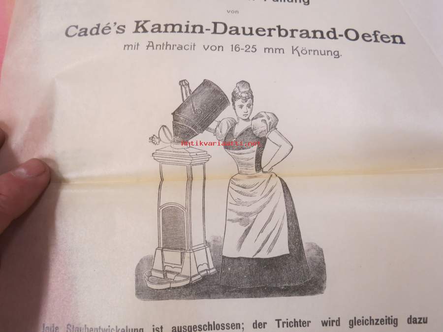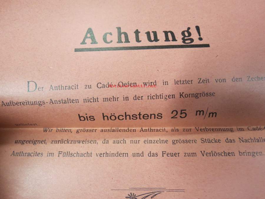 Eimer mit Trichter - Cade´s Kamin-Dauerbrand-Oefen -esite, ohjeita, lista sopivan kokoisen polttoaineen (antrasiitin) myyjistä, saksankielisiä