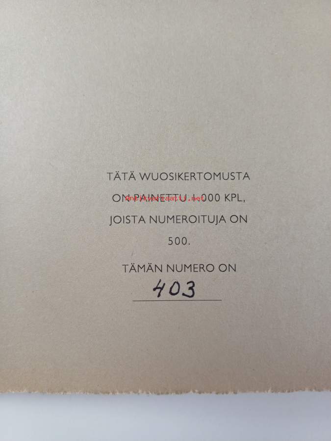 Hyvä. Tarkempi kuntoluokka: K3+ ; Hieman käytön jälkeä kansissa, selkämyksessä hieman vinoutta. numeroitu 403/500