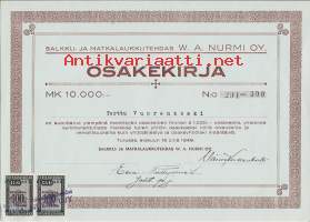 Salkku- ja Matkalaukkutehdas W.A.Nurmi Oy, 10 000 mk osakekirja, Turku 16.8.1949