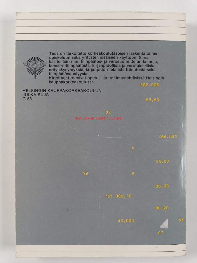 Merkinnät: omistajamerkintä leikattu pois etulehden ylälaidastaSarja: Helsingin kauppakorkeakoulun julkaisuja. C, Oppikirjoja 53Asiasanat: tilinpäätös, verotus, kirjanpito, tilintarkastus, beskattning, bokföring, bokslut, revision