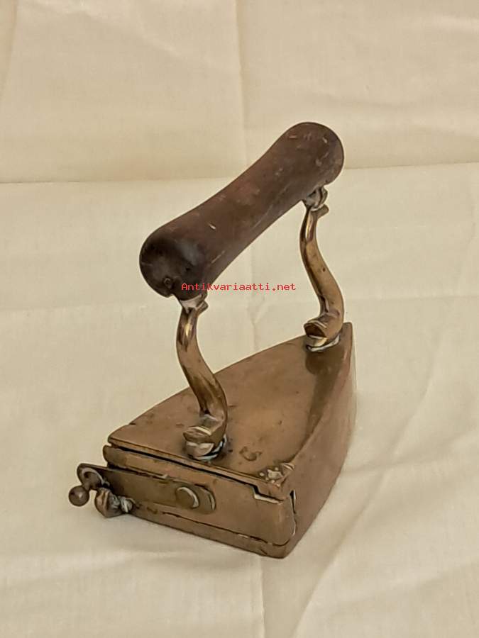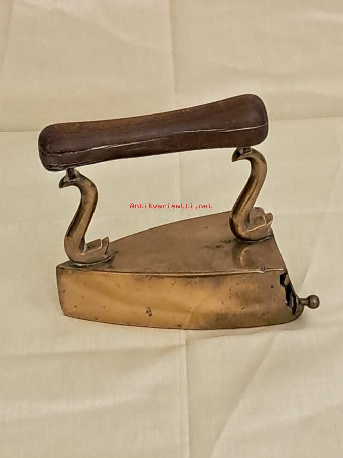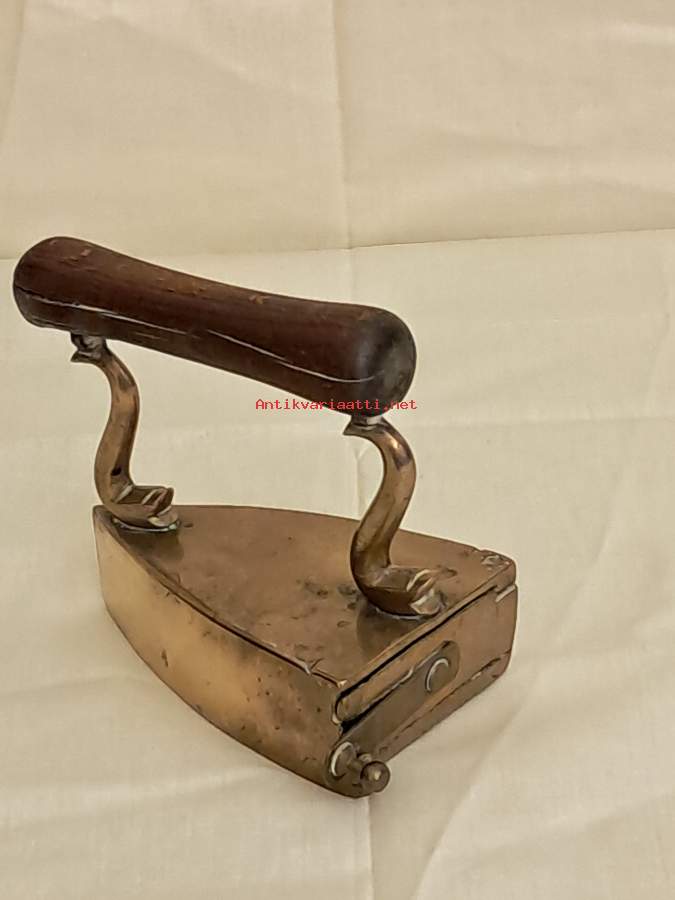 Koko: 13 ¤ 8 ¤ 12 cm. Paino 850 g. Kahva puuta. Messinkiä käytettiin usein koristeellisemmissa tai kevyemmissä silitysrautamalleissa. Tällaiset silitysraudat ovat tyypillisesti peräisin 1800-luvun lopulta tai 1900-luvun alusta, mahdollisesti valmistettu Pohjois-Euroopassa tai Saksassa.