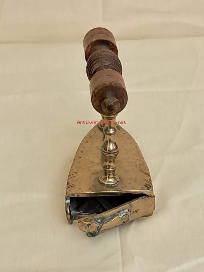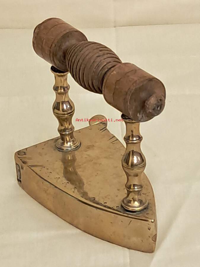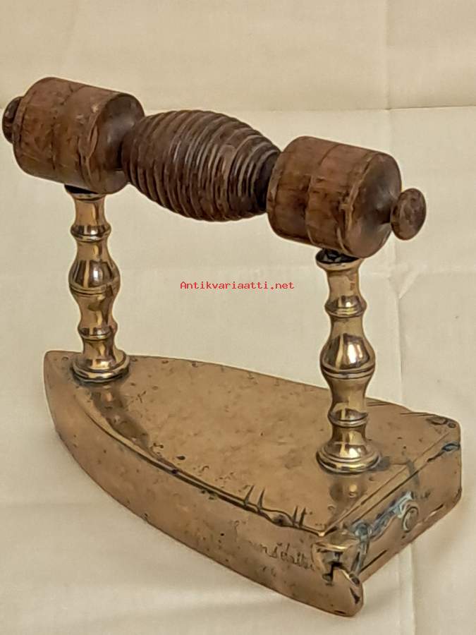 Koko: 14,5 ¤ 8 ¤ 13 cm. Paino 730 g. Kahva puuta. Messinkiä käytettiin usein koristeellisemmissa tai kevyemmissä silitysrautamalleissa. Tällaiset silitysraudat ovat tyypillisesti peräisin 1800-luvun lopulta tai 1900-luvun alusta, mahdollisesti valmistettu Pohjois-Euroopassa tai Saksassa.