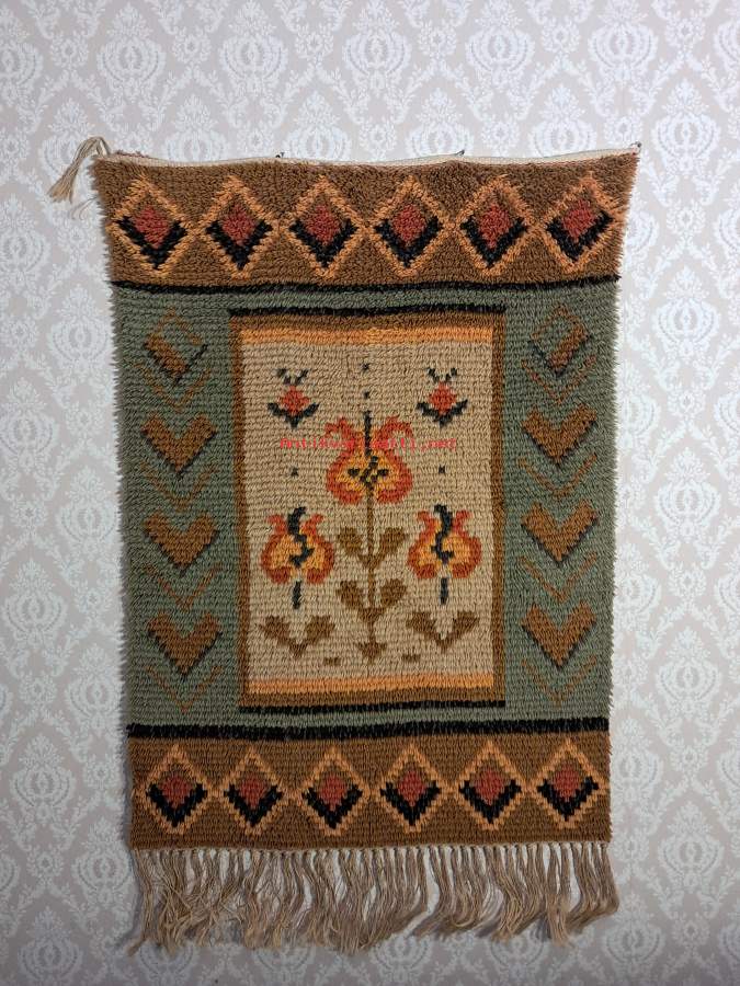 Suomalainen ryijy - 114 cm ¤ 72 cm. (Seinävaate, sisustuselementti, vanhat ryijyt, 50-luku ? )