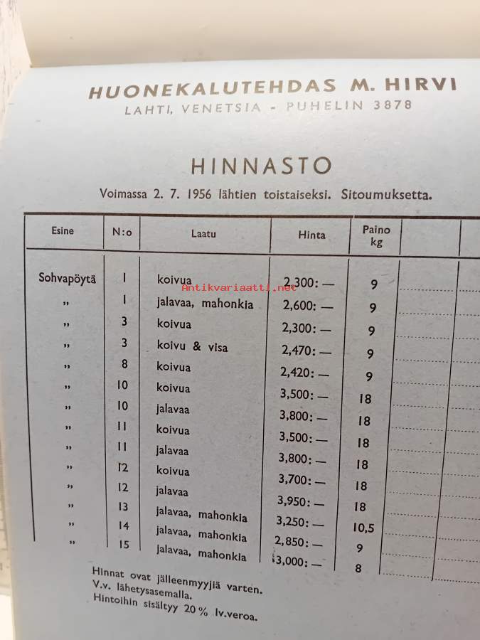 Huonekalutehdas M. Hirvi Lahti tuoteluettelo/hinnasto 1956