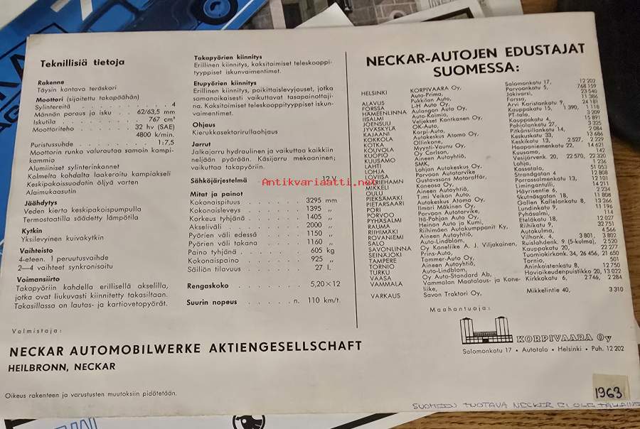 Neckar 2D Jagst 770, vm. 1964, IN-465, omistaja Laukon Auto, Tampere -rekisteriote / registerutdrag