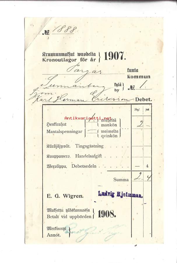 Kruununverot vuodelta 1907 - 08 Pargas kommun - firmalomake