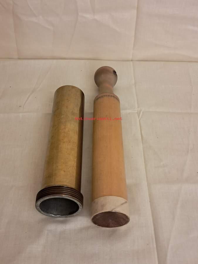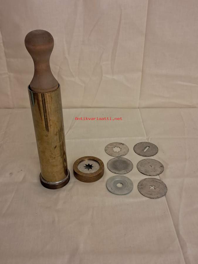 Messinkirunkoinen puristin koostuu sylinteristä, puukahvasta ja useista vaihdettavista metallilevyistä, joilla saadaan aikaan erilaisia piparkakku- tai pikkuleipämuotoja. Mukana 6 erilaista muotolevyä. Otaksuttavasti 1950-luku.
