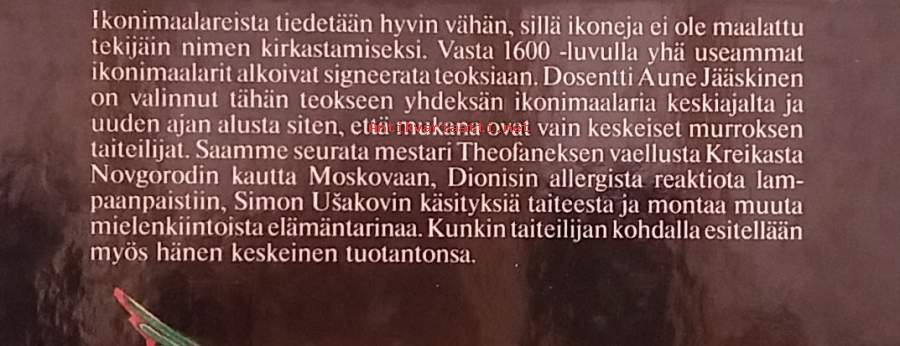 Dosentti Aune Jääskinen on valinnut teokseen yhdeksän ikonimaalaria keskiajalta ja uuden ajan alusta site, että mukana ovat vain keskeiset murroksen taiteilijat. Kuvitettu. Dimensiot