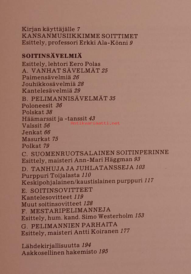 Sisältää runsaasti suomalaisia soitinsävelmiä polkasta masurkkaan häämarsseitta jenkkoihin + pelimannien esittelyä, soitinperinteen kuvaus, kansanmusiikin soittimet, vanhat sävelmät jne. Kuvitettu. Dimensiot 25 ¤ 18 cm
