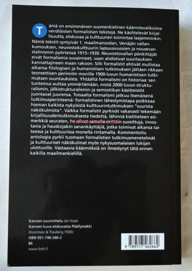 Teos sisältää venäläisen formalistisen koulukunnan (1910-1930) edustajien kirjoituksia. Venäläinen formalismi on olennainen, pysyvä osa eurooppalaista humanistista tutkimusperinnettä. Ilman sitä ei olisi strukturalismia eikä semiotiikkaa. Venäläinen formalismi suuntasi huomion muotoon ja kieleen: taideteos on ymmärrettävissä vain tutkimalla sen muotoa. Hyvät kommentti- ja hakemisto-osastot.