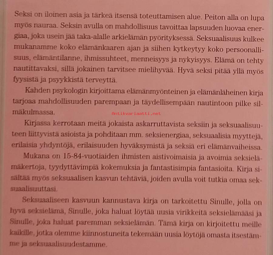 Kirja on tarkoitettu niille, jotka ovat kiinnostuneita tekemään uusia löytöjä omasta itsestämme ja seksuaalisuudestamme, sillä seksi on iloinen asia ja tärkeä itsensä toteuttamisen alue. Hyvä seksi pitää yllä myös fyysistä ja psyykkistä terveyttä. Ikäryhmät: 15-30 vuotiaat, 31-50 vuotiaat, 51-84 vuotiaat. Dimensiot 22 ¤ 15 cm.