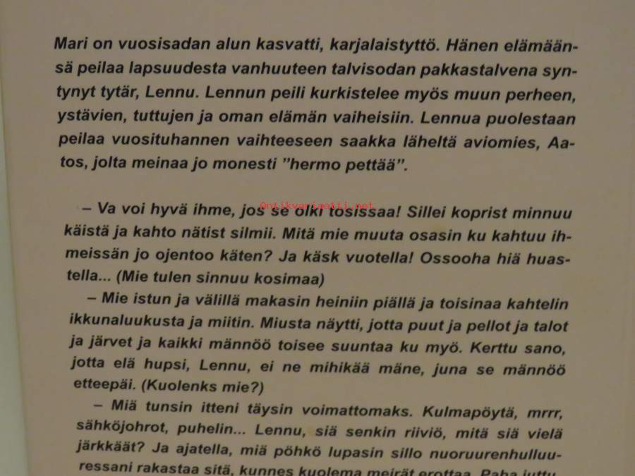 Kuin katselisi kuvastimesta, 2000. Mari on vuosisadan alun kasvatti, karkalaistyttö. Hänellä on talvisodan aikana syntynyt tytär Lennu.