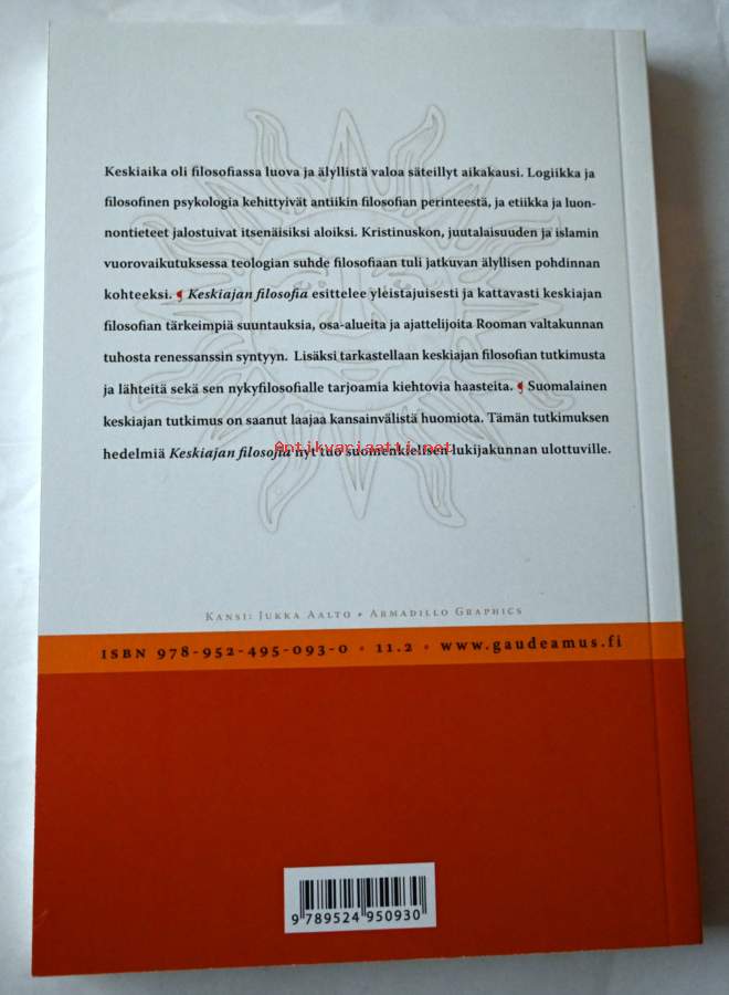 Keskiaika oli filosofiassa luova ja älyllistä valoa säteillyt aikakausi. Logiikka ja filosofinen psykologia kehittyivät antiikin filosofian perinteestä, ja etiikka ja luonnontieteet jalostuivat itsenäisiksi aloiksi. Kristinuskon, juutalaisuuden ja islamin vuorovaikutuksessa teologian suhde filosofiaan tuli jatkuvan älyllisen pohdinnan kohteeksi. Keskiajan filosofia esittelee yleistajuisesti ja kattavasti keskiajan filosofian tärkeimpiä suuntauksia, osa-alueita ja ajattelijoita Rooman valtakunnan tuhosta renessanssin syntyyn. Lisäksi tarkastellaan keskiajan filosofian tutkimusta ja lähteitä sekä sen nykyfilosofialle tarjoamia kiehtovia haasteita. Suomalainen keskiajan tutkimus on saanut laajaa kansainvälistä huomiota. Tämän tutkimuksen hedelmiä Keskiajan filosofia nyt tuo suomenkielisen lukijakunnan ulottuville.