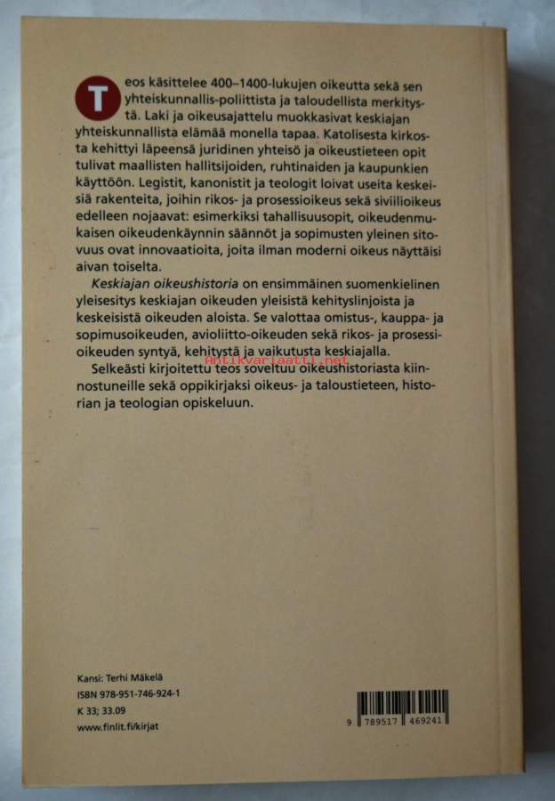 Teos käsittelee 400-1400-lukujen oikeutta sekä sen yhteiskunnallis-poliittista ja taloudellista merkitystä. Laki ja oikeusajattelu muokkasivat keskiajan yhteiskunnallista elämää monella tapaa. Katolisesta kirkosta kehittyi läpeensä juridinen yhteisö ja oikeustieteen opit tulivat maallisten hallitsijoiden, ruhtinaiden ja kaupunkien käyttöön. Legistit, kanonistit ja teologit loivat useita keskeisiä rakenteita, joihin rikos- ja prosessioikeus sekä siviilioikeus edelleen nojaavat: esimerkiksi tahallisuusopit, oikeudenmukaisen oikeudenkäynnin säännöt ja sopimusten yleinen sitovuus ovat innovaatioita, joita ilman moderni oikeus näyttäisi aivan toiselta. Keskiajan oikeushistoria on ensimmäinen suomenkielinen yleisesitys keskiajan oikeuden yleisistä kehityslinjoista ja keskeisistä oikeuden aloista. Se valottaa omistus-, kauppa- ja sopimusoikeuden, avioliitto-oikeuden sekä rikos- ja prosessioikeuden syntyä, kehitystä ja vaikutusta keskiajalla. Selkeästi kirjoitettu teos soveltuu asiasta kiinnostuneille sekä oppikirjaksi oikeus- ja taloustieteen, historian ja teologian opiskeluun.