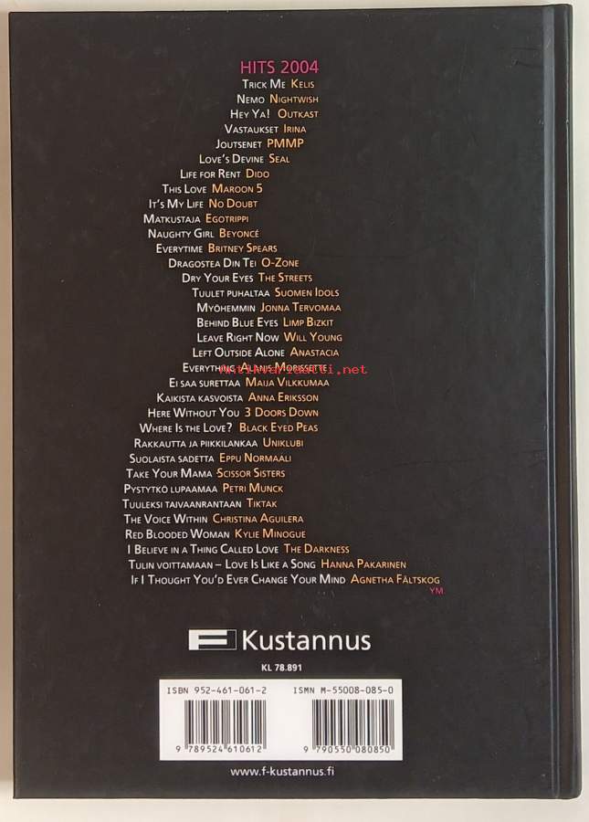 Nuottikirja 2004 vuoden hiteistä.Dimensiot: 25x18cm