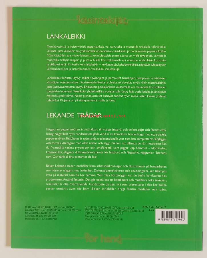 Kirjontaa ja paperilankakoristelua = Lekande trådar : broderier och dekorationer med pappersnörenKuvitettu.Dimensiot: 27x21cm