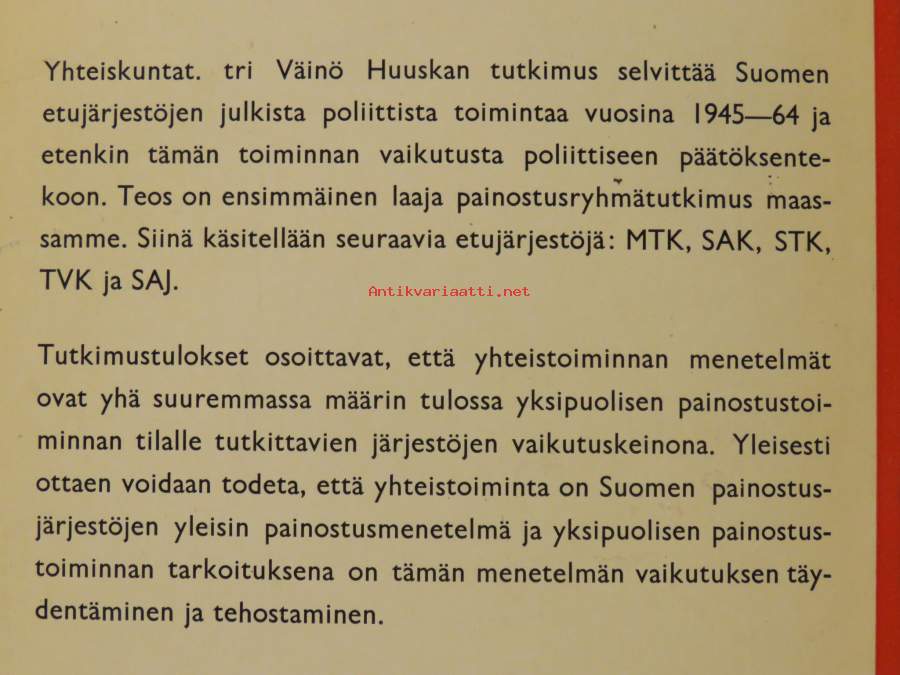 Etujärjestöjen painostuspolitiikka Suomessa : Tutkimus Maataloustuottajain keskusliiton, Suomen ammattiyhdistysten keskusliiton, Suomen työnantajain keskusliiton,...