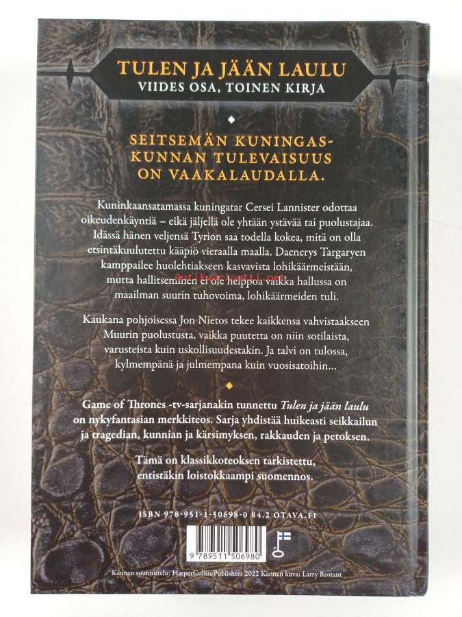 Sarja: Tulen ja jään laulu 7Alkuteos: A Dance with DragonsAsiasanat: murha, fantasiakirjallisuus, sisällissodat, hallitsijat, petos, kunnia, seikkailu, maanpako, lohikäärmeet, kosto, valtataistelu, juonittelu, hyvän ja pahan välinen taistelu, sukuviha