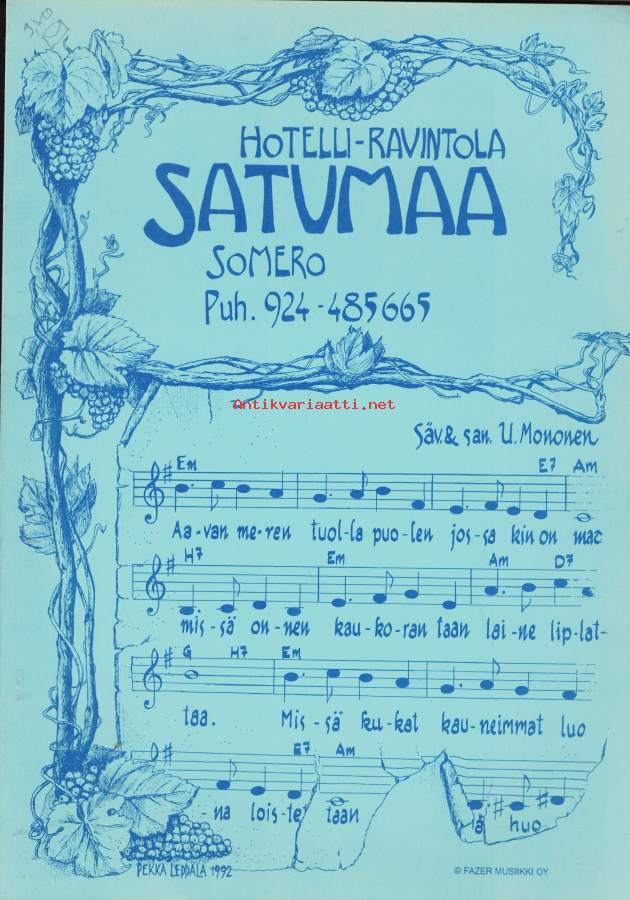 Ruokalista sisäaukeamalla, mutta ilman hintoja. Kannen kuva vuodelta 1992, takakannessa solistin merkintä vuodelta 2003.-Postitus 3,80€