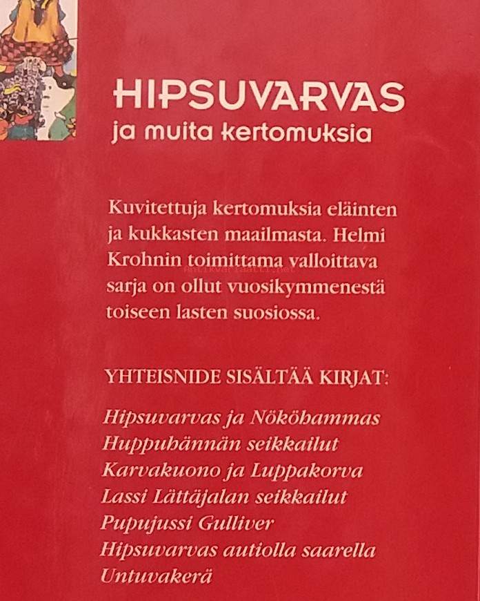 Helmi Krohnin ajattomat Hipsuvarvas-tarinat tarjoavat sukupolvesta toiseen iloa vauhdikkailla eläinseikkailuilla ja lumoavalla kuvituksella. Nostalginen klassikkosarja saa uuden elämän nelivärikuvituksen myötä. Hipsuvarpaan lisäksi tarinoissa seikkailevat Nököhampa, Huppuhäntä, Karvakuono ja Luppakorva, Lassi Lättäjalka, Puuppussi Gulliver sekä Untuvarsi. Kuvitettu. Dimensiot 19 ¤ 12 cm